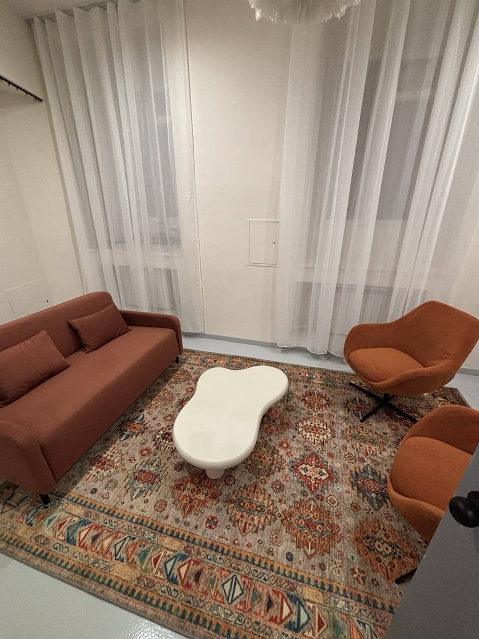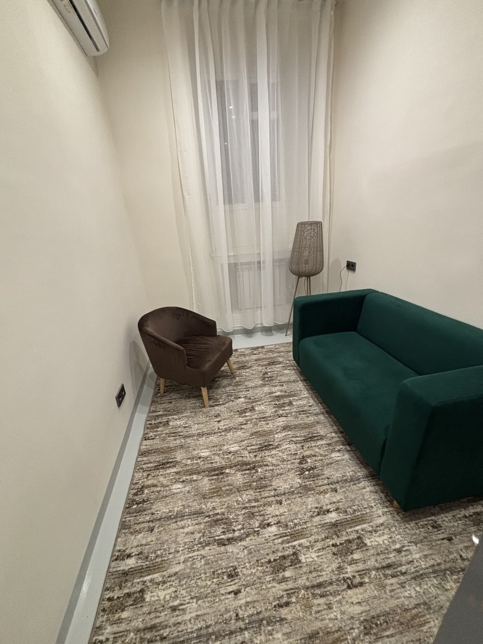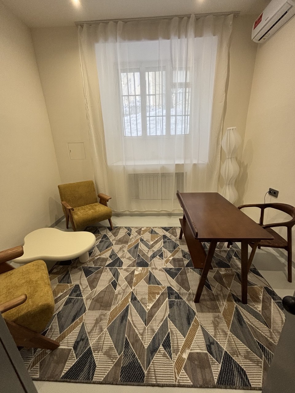 диваны, кресла, журнальные столики, рабочие столы и мягкое освещение. Интерьер выполнен в спокойных нейтральных тонах, что помогает создать безопасную и доверительную атмосферу для консультаций.